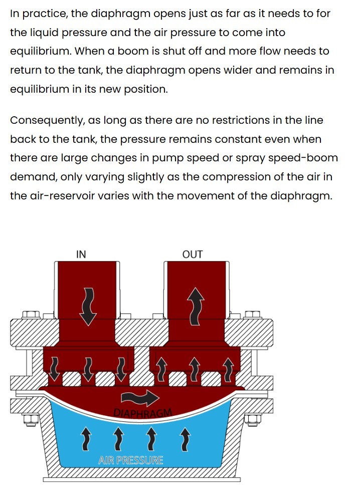 The working principle of the Ramsay valve is based on two pressures: the air pressure and the fluid pressure. If the air pressure, that is set to the desired system pressure, is higher than the fluid pressure, the diaphragm is pushed up and the chemical mix goes straight from the supply line to the nozzles. No fluid will flow through the Ramsay valve. If the air pressure is lower than the fluid pressure, the chemical mix goes through the valve into the dump line and returns to